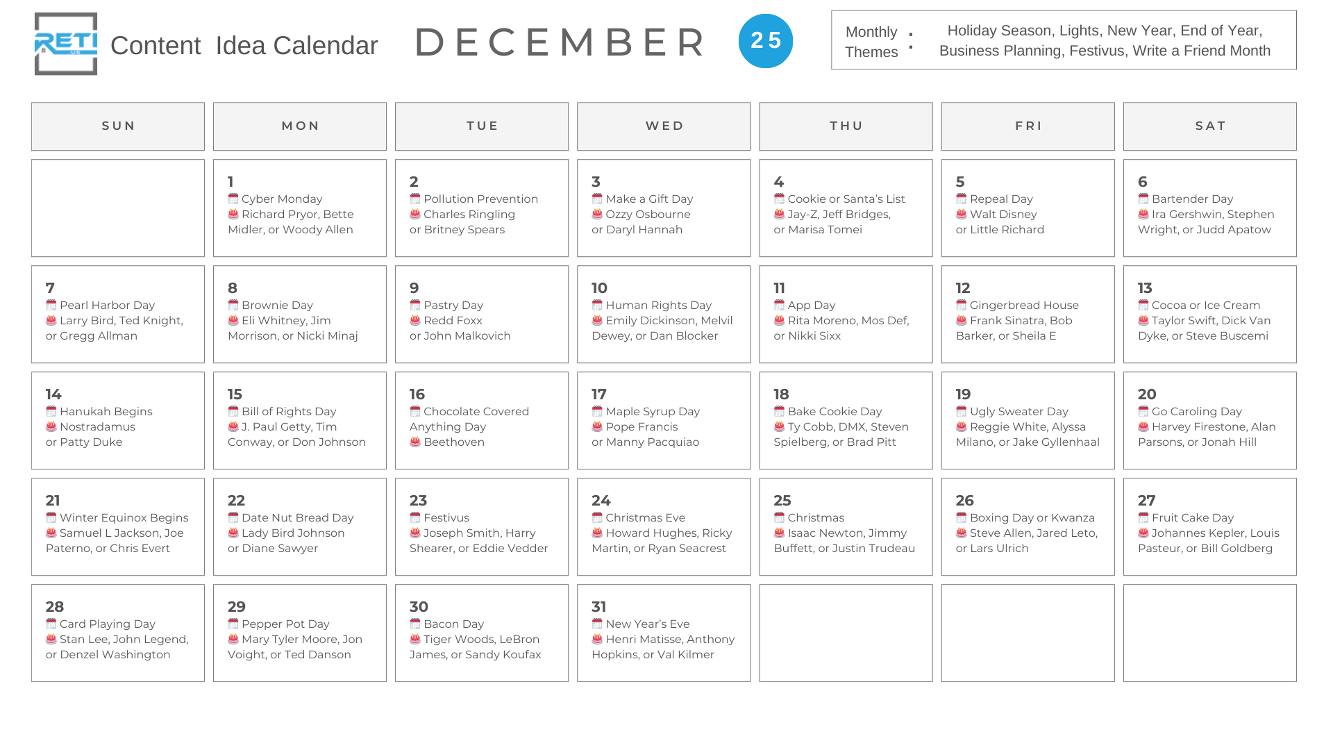 Click on the image to see it larger, or click here to download the PDF version of the calendarRETI 2025 Content Idea Posting Calendar December